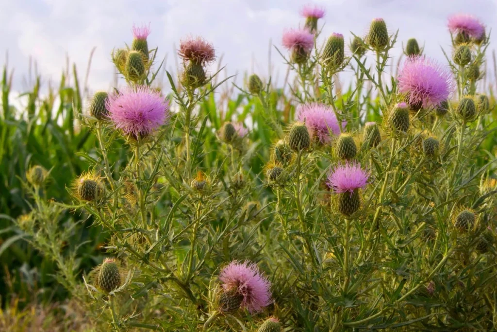 Creeping thistles are a perennial weed widely found across the UK. They are highly competitive with grass due to their extensive underground root systems that allow patches to spread, forming buds from thickened lateral roots. Thistle control can be challenging as the weeds spread vigorously.